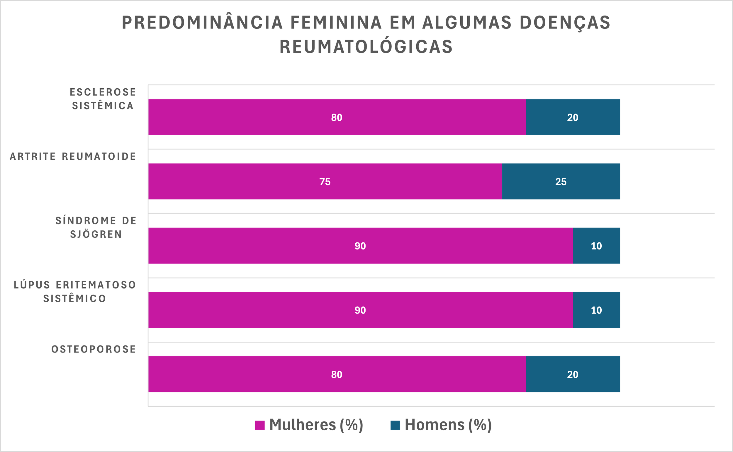 Essas proporções podem variar entre estudos e populações, mas a tendência geral é bastante consistente: muitas doenças da reumatologia são mais frequentes no público feminino.